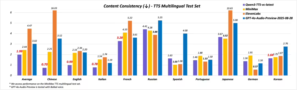 据ITCOW牛新网了解,另一款Qwen3-TTS-VC-Flash模型具备仅需3秒音频即可完成音色克隆的能力,并支持基于克隆音色生成中文、英文、德语、意大利语、葡萄牙语、西班牙语、日语、韩语、法语及俄语等10种主流语言的语音。在MiniMax TTS多语言测试集上,该模型在内容稳定性方面优于MiniMax、ElevenLabs和GPT-4o-Audio-Preview,其平均词错误率(WER)位列第一。