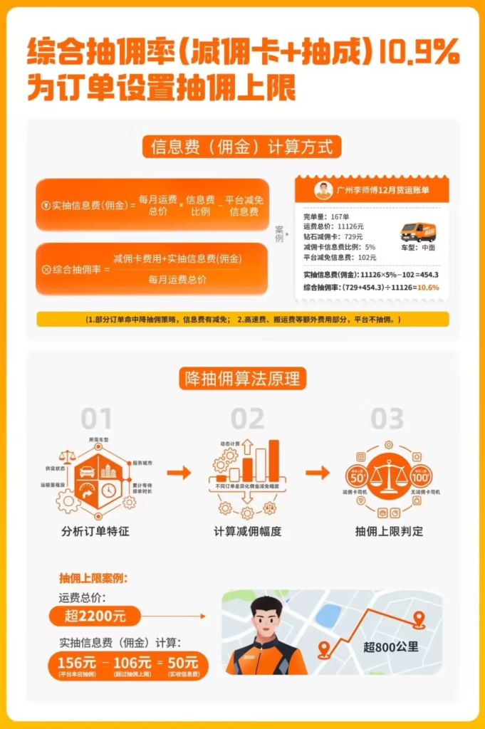 根据最新算法规则,货拉拉对用户出价单、顺路单、拼车单及100公里以上的长途订单实行差异化抽佣政策,并设置单笔订单抽佣上限。未使用减佣卡的司机每单抽佣上限为100元,使用减佣卡的司机则可进一步将上限降至50元。数据显示,2025年货拉拉在降抽佣方面累计让利达2.6亿元,平台综合抽佣率从2023年的12.2%降至10.9%。